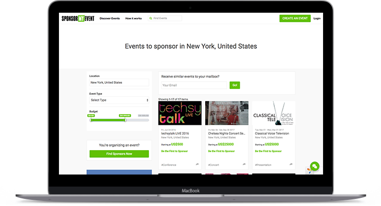 Search thousands of events and filter by event category, location, budget and keywords. Each event has a digital prospectus with information about the event and provides instant access to sponsorship offerings and pricing.